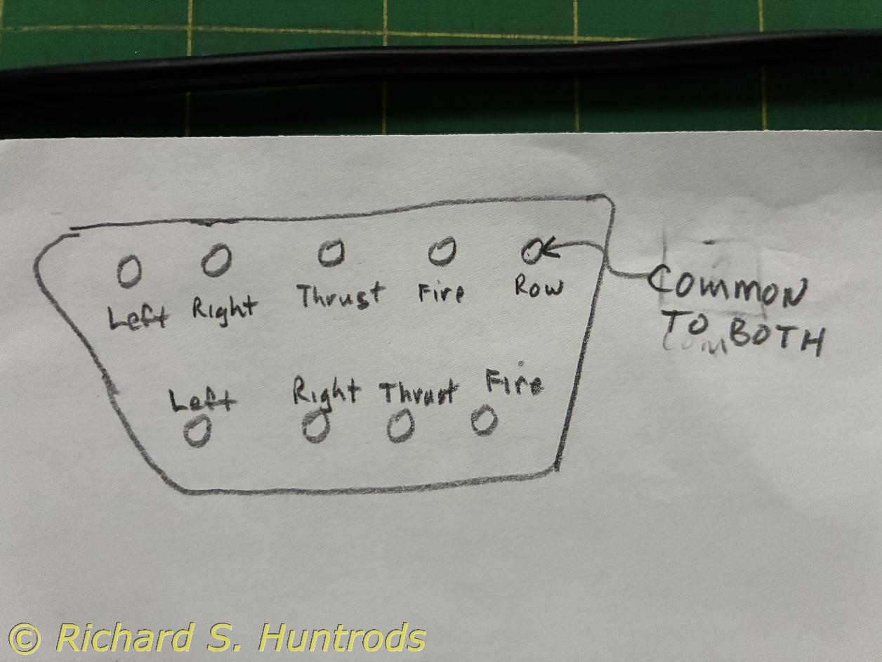 my colors such that green was RIGHT, red was LEFT, white was ROW (common) and then black and yellow were THRUST and FIRE. The locations