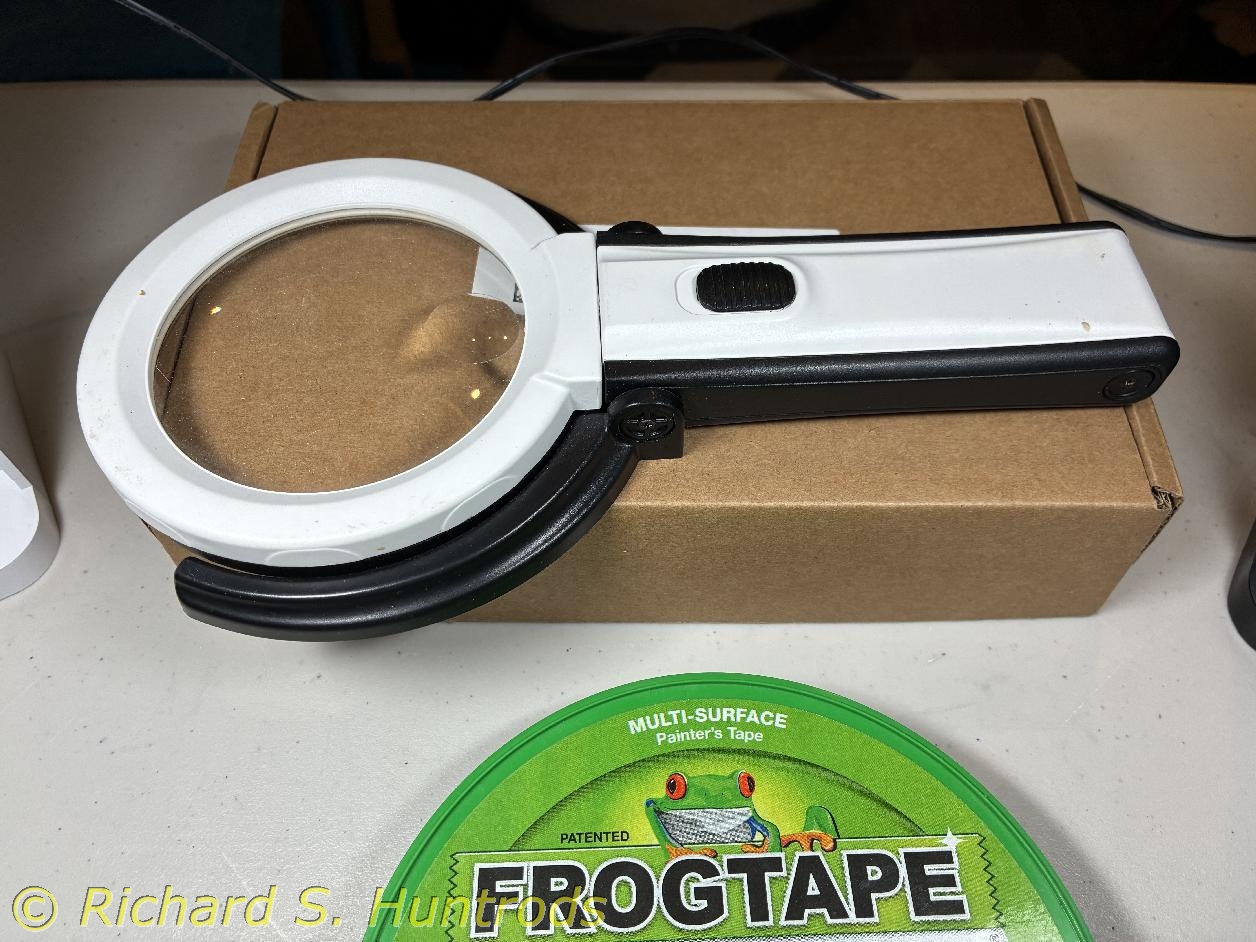 This fourth photo shows my magnifier. I bought this off Amazon many years ago. It is battery powered (2xAA) with a ring of